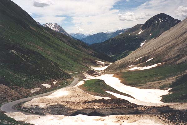 Fyra pass på en och samma dag! Under förmiddagen klättrade vi upp till Berninapass på 2330 möh. Vägen gick genom en vacker skog med det imponerande berget Piz Bernina på drygt 4000 möh som utsikt. Längs vägen går även här en av de många järnvägslinjerna i Schweiz, som på något märkligt sätt tar sig över alla pass. Just den här linjen lär vara den högsta järnvägen i Europa. Upp mot passet planade det ut något och våra ben kändes alltför bra för att hålla igen på farten. Vi växlade därför upp till en tyngre växel och drog om en del racercyklister som var ute på sina träningsrundor. "You crazy Swedes!", var kommentaren från en av dem när han nådde passet en stund efter oss...